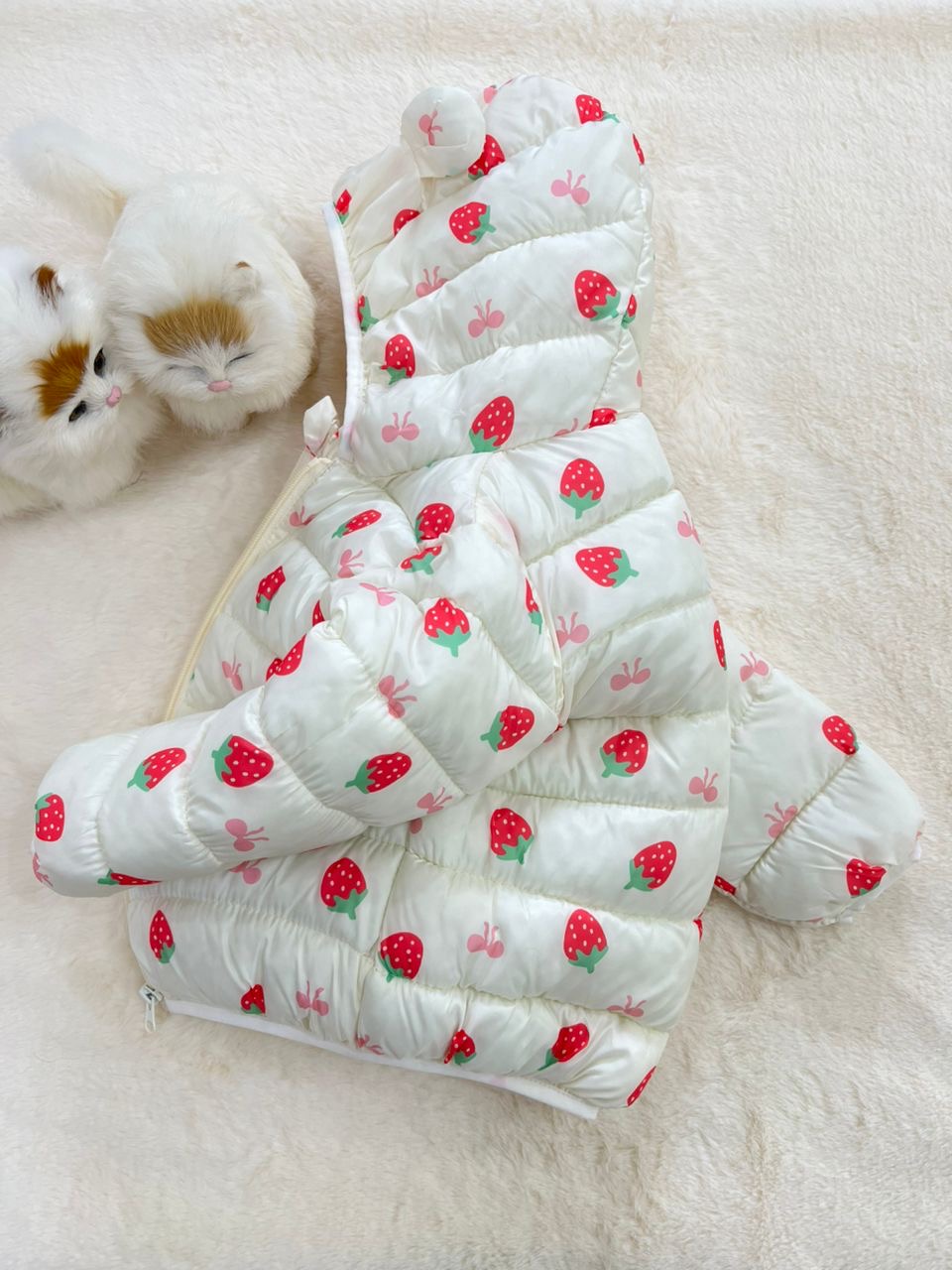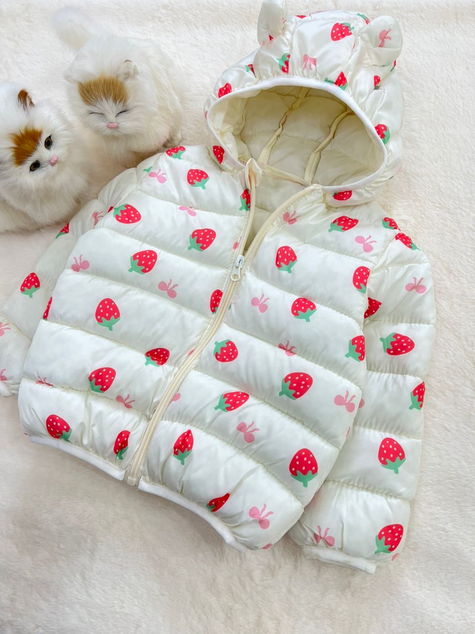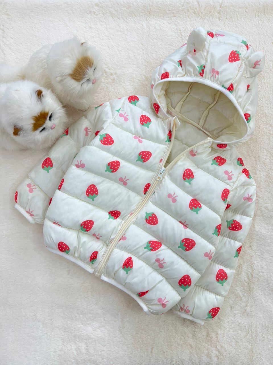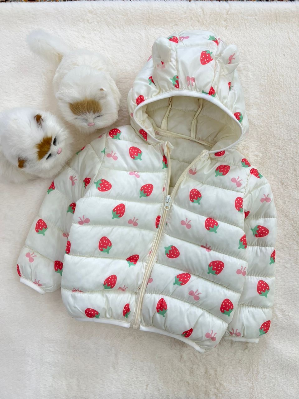- کاپشن نقلی دخترانه طرح توت فرنگی مناسب سنین یک تا پنج سال کد 214