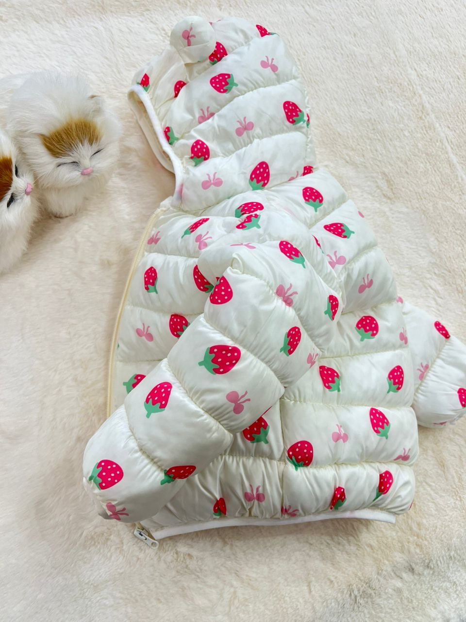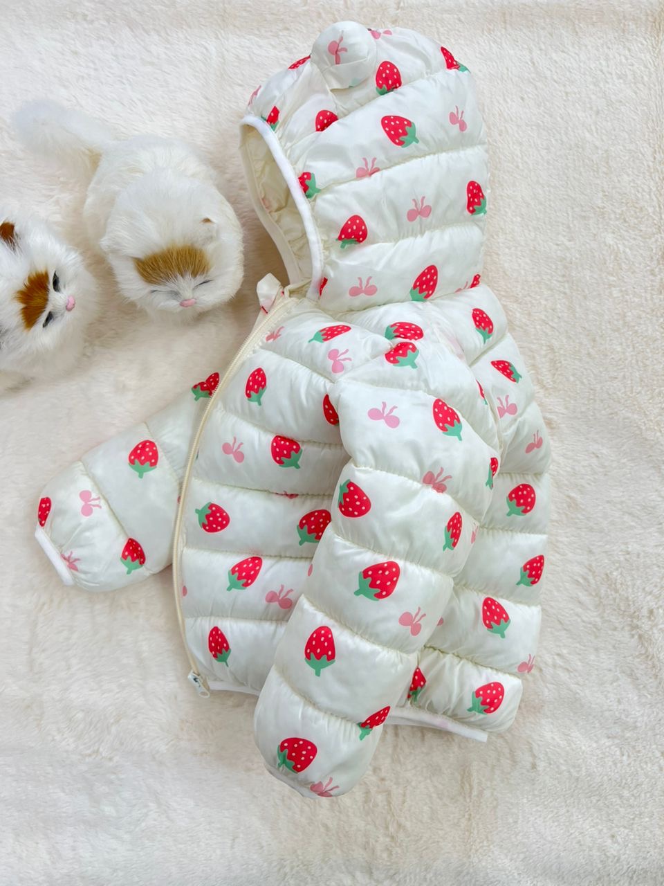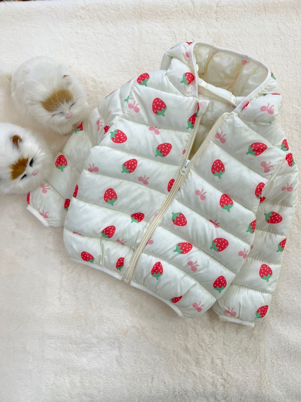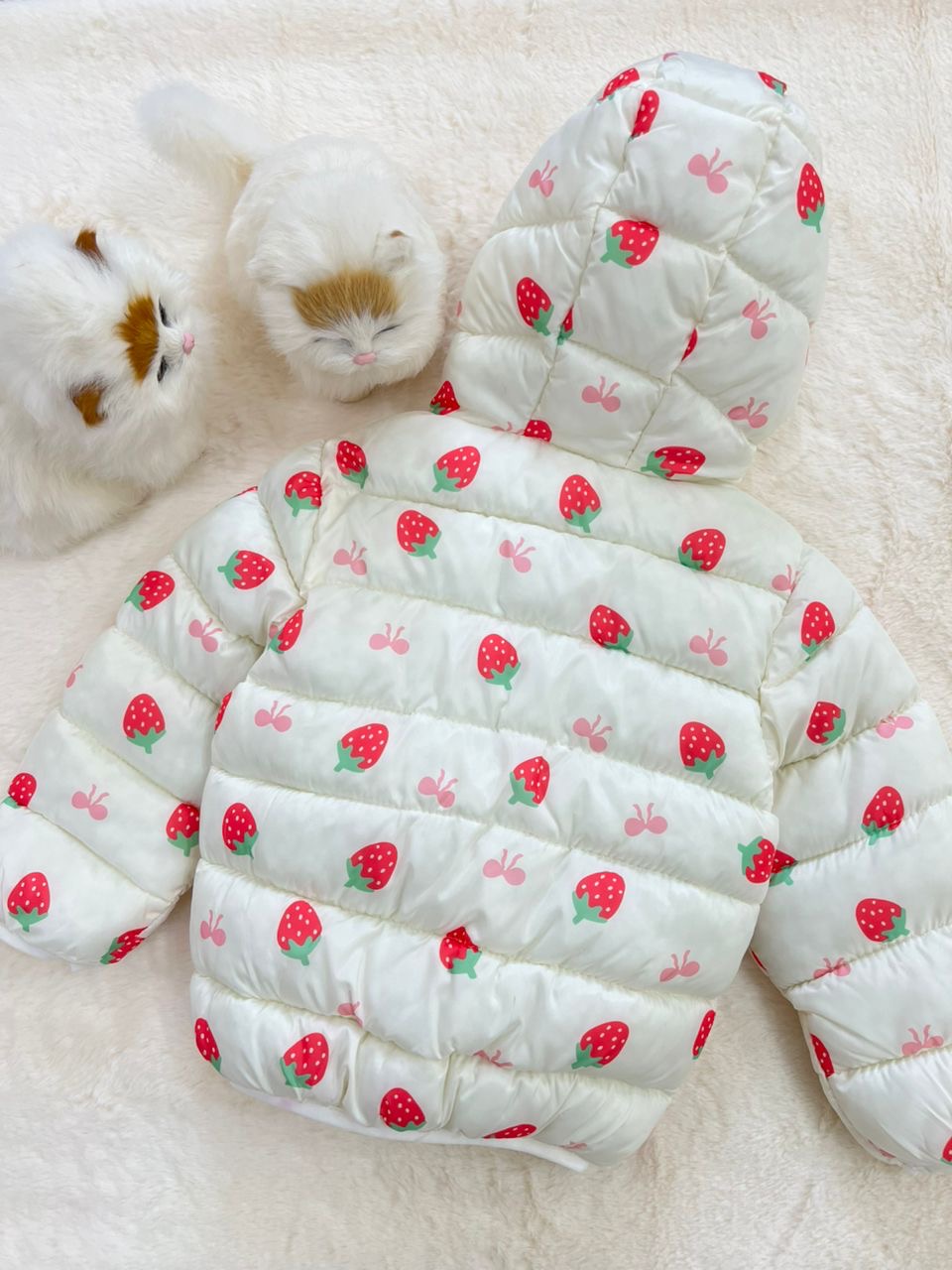 - کاپشن نقلی دخترانه طرح توت فرنگی مناسب سنین یک تا پنج سال کد 214