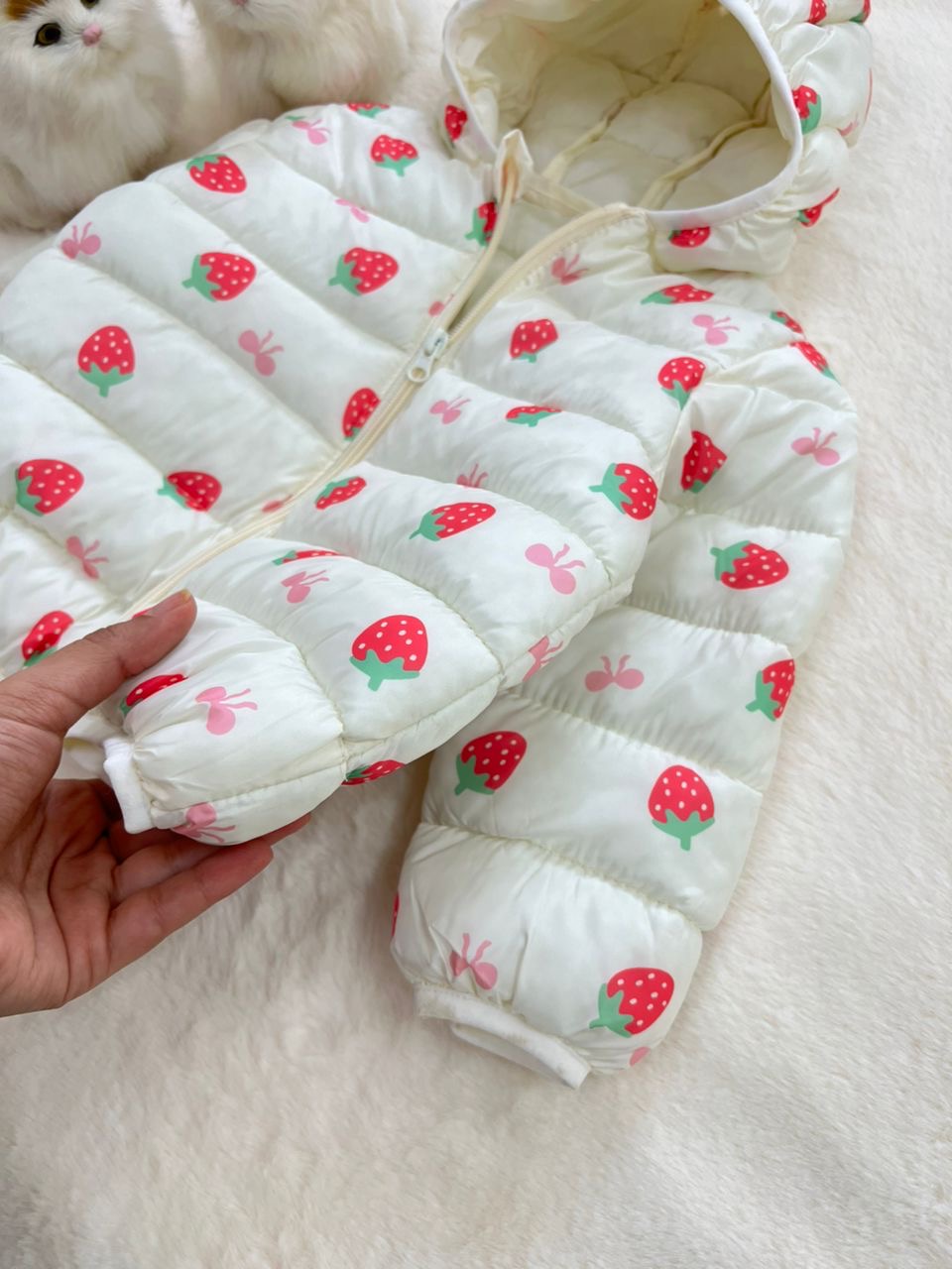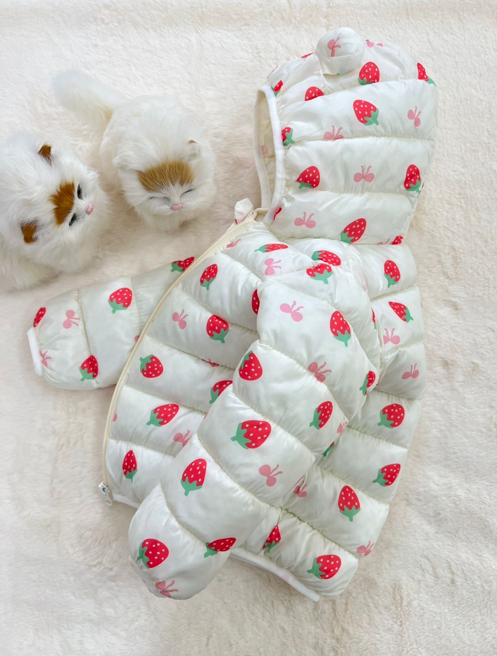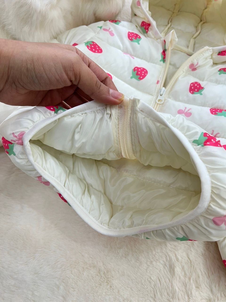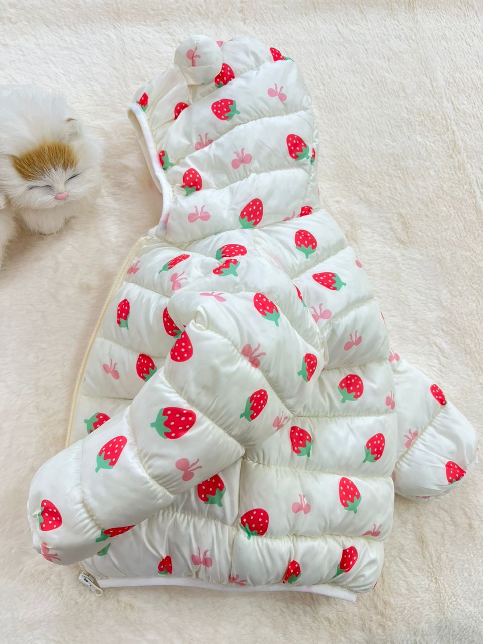 - کاپشن نقلی دخترانه طرح توت فرنگی مناسب سنین یک تا پنج سال کد 214